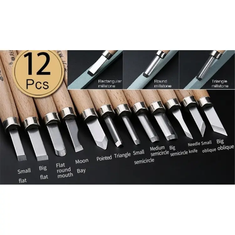 12 পিস চায়না স্টিল কাঠের কাট হাতের কাঠের খোদাই করা ছুরির কাটার সেট বক্স সহ