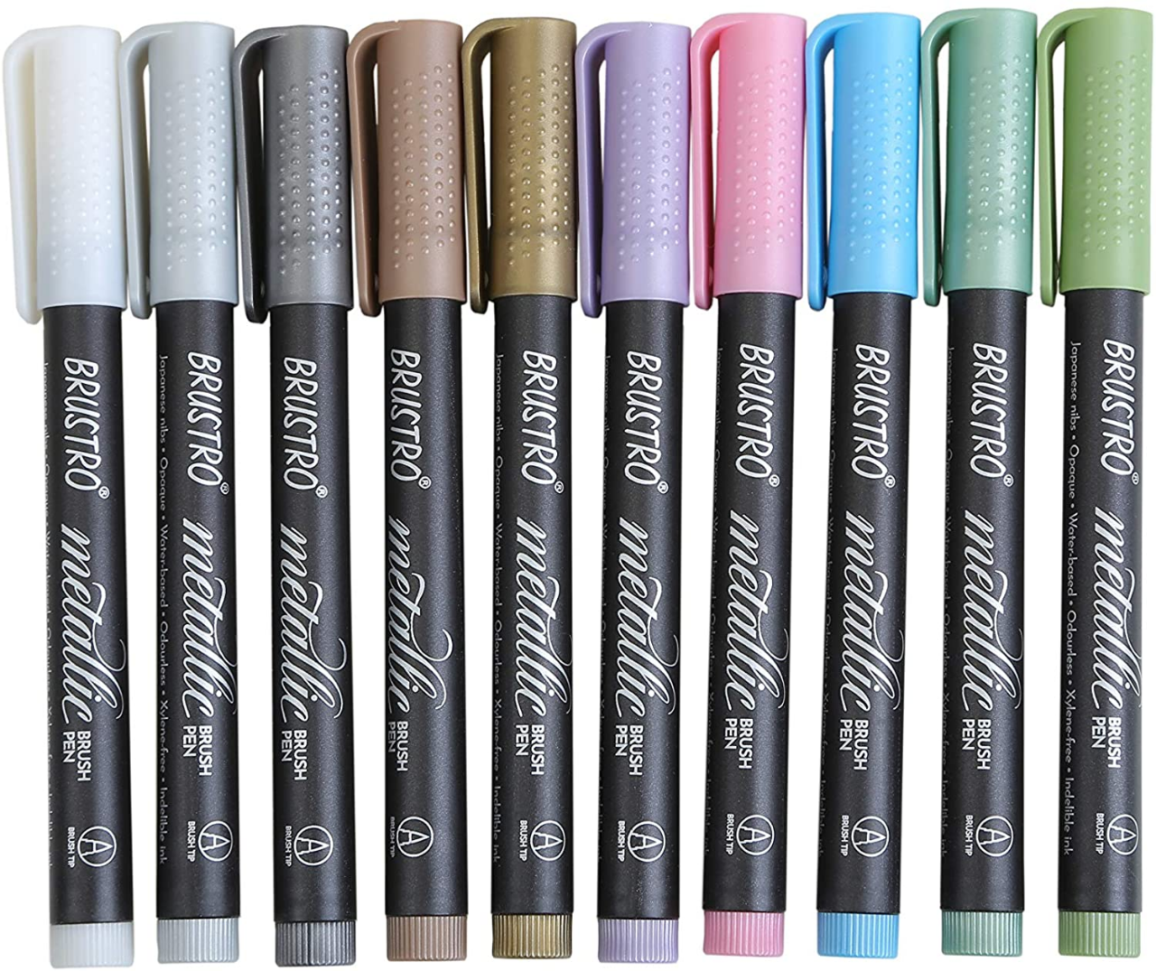 BRUSTRO Metallic Brush Pens - Soft Brush Tip for Calligraphy, Hand Lettering, Colouring, Scrapbooking, Card Making - Set of 10 Colors.