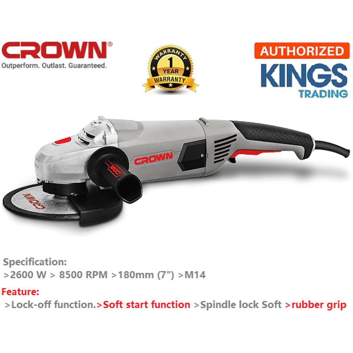 - This Crown 7" Angle Grinder is a powerful tool that can handle tough grinding and cutting tasks with ease. With a rated power of 2600W and a rated speed of 8500 RPM, this corded angle grinder is perfect for use in the workshop or on the job site. The soft start function and spindle lock make it easy to use, while the soft rubber grip and lock-off function ensure safety and comfort during operation. The grinder has a M14 spindle thread and can accommodate cutting discs up to 180mm in diameter. The delivery set includes an angle grinder, owner's manual, flange wrench, additional handle, and protective casing. This tool is perfect for professionals and DIY enthusiasts alike who need a reliable and powerful angle grinder for their projects.