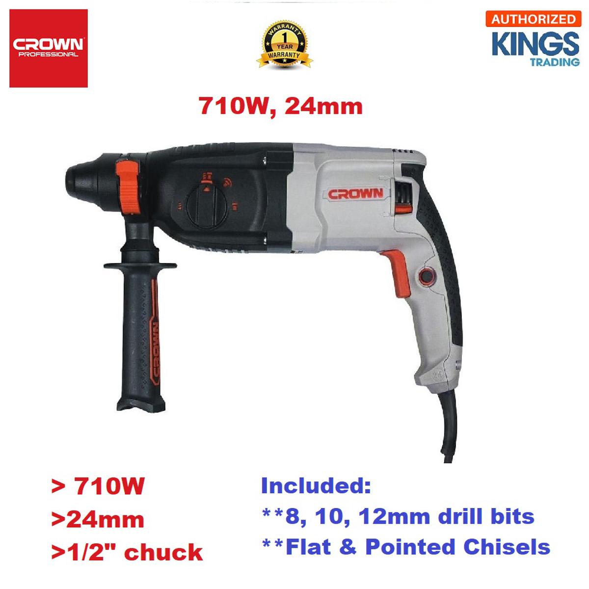 - Introducing the Crown Rotary Hammer SDS-Plus 710W, Model CT18181 - the perfect tool for all your drilling needs. With a drilling output of up to 24mm and a powerful 710W motor, this corded hammer drill is perfect for both DIY enthusiasts and professionals alike. The drill comes with 3 pieces of drill bits, flat and pointed chisels, making it versatile for a range of applications. The SDS PLUS chuck and electronic speed control ensure precision and accuracy while the 3 function modes - drilling, impact drilling and chiseling - make it easy to switch between tasks. The Vario-Lock rotational direction switch and safety clutch add to the drill's safety features. Weighing only 2.65kg, this drill is lightweight and easy to handle. The Crown Rotary Hammer SDS-Plus 710W is a must-have for anyone looking for a reliable and efficient hammer drill.