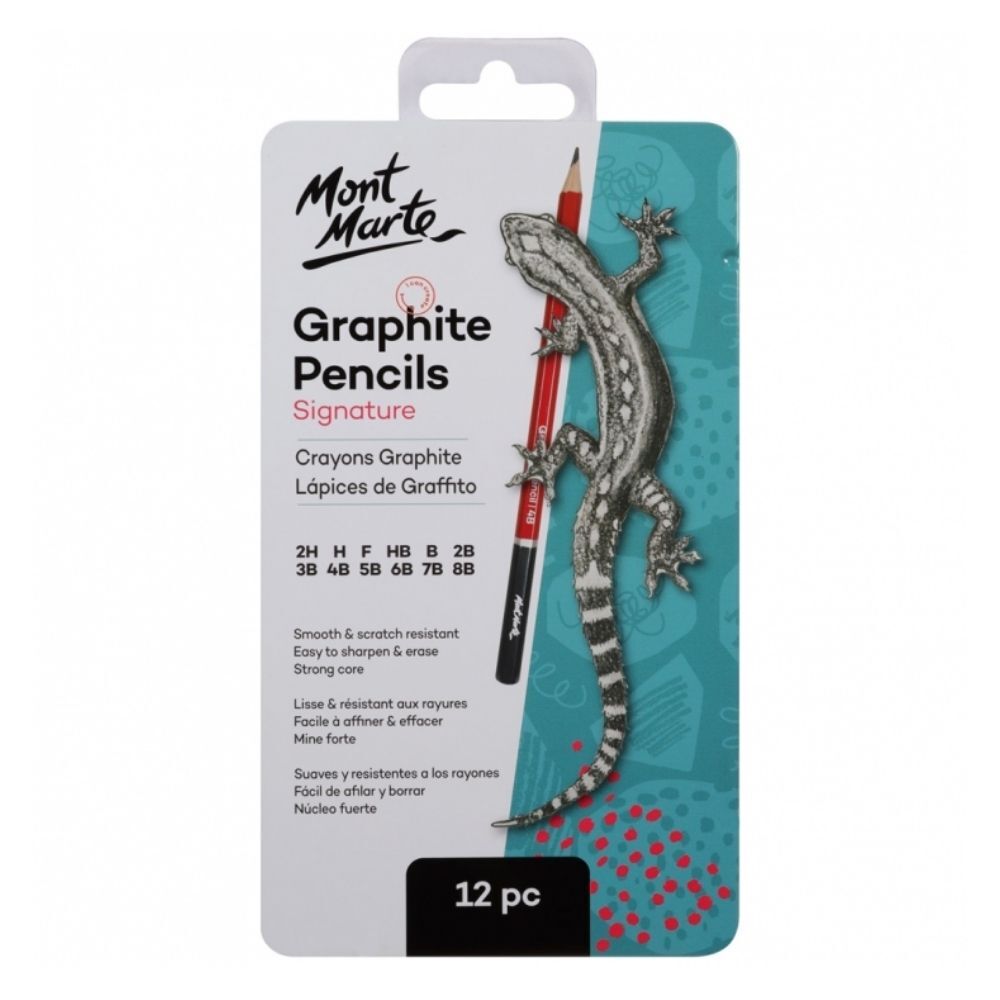 Mont Marte Graphite Pencils with metal box 12pc 2H, H, F, HB, B, 2B, 3B, 4B, 5B, 6B, 7B, 8B