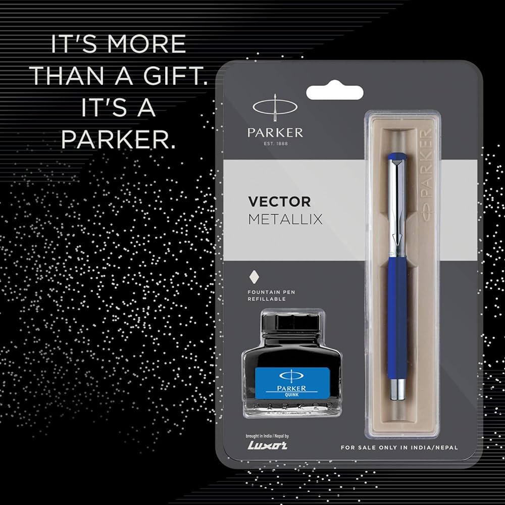 Parker Vector Mettalix Fountain Pen (Blue) with Free Blue Quink Ink Bottle