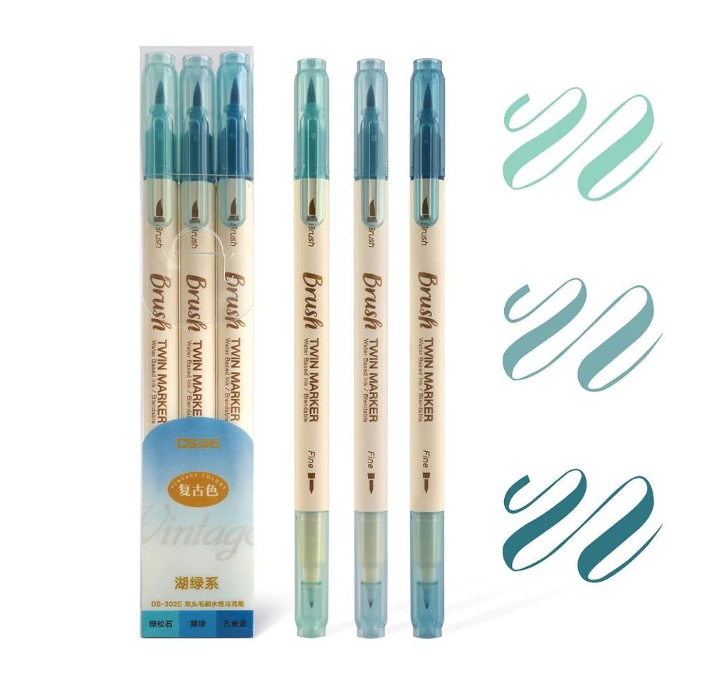 Retro color Brush Pens Set Dual side Fine Liner Water Based Ink 3PCS set - Blue